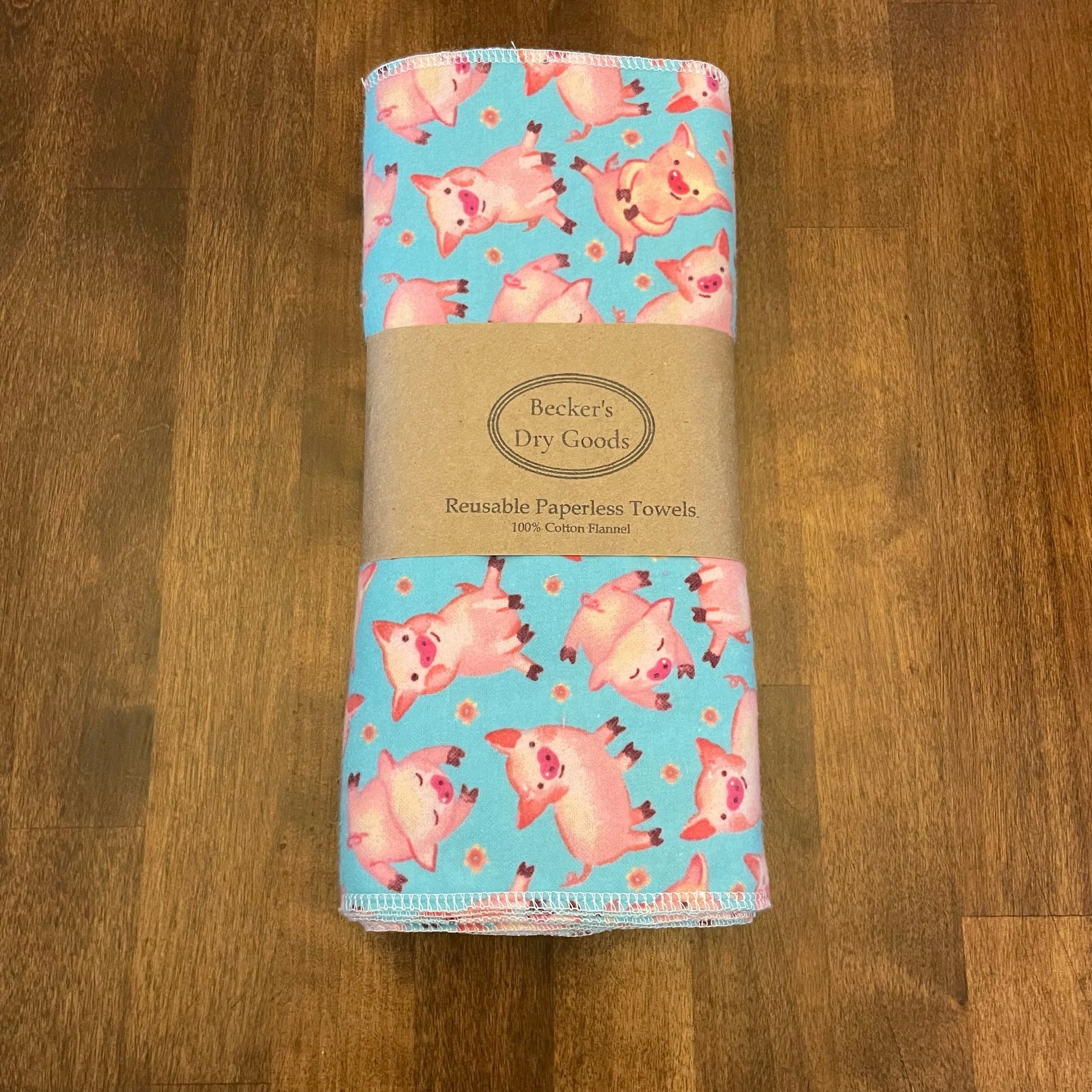 Our Paperless Towels are approximately 10"x12" and are made from 100% cotton flannel. Each towel is handmade and given finished edges to keep the fabric from fraying due to normal use and wash. These Paperless Towels are machine washable and will get more absorbent the more they are used.