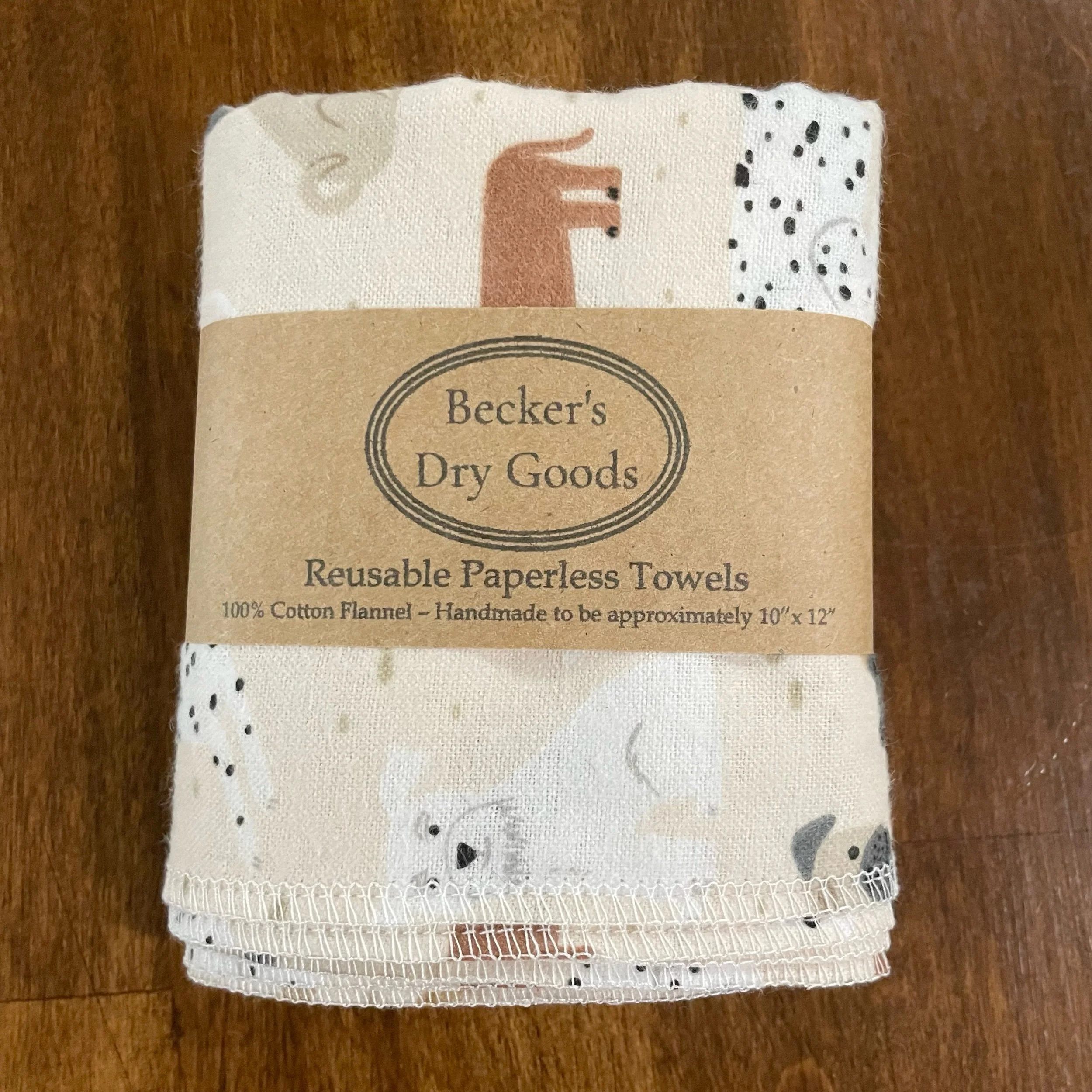 Our Paperless Towels are approximately 10"x12" and are made from 100% cotton flannel. Each towel is handmade and given finished edges to keep the fabric from fraying due to normal use and wash. These Paperless Towels are machine washable and will get more absorbent the more they are used.